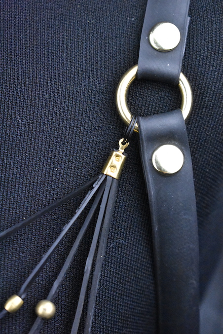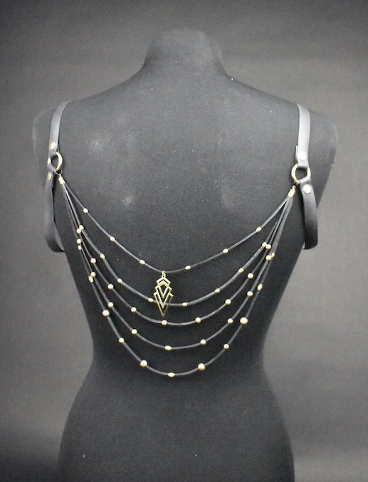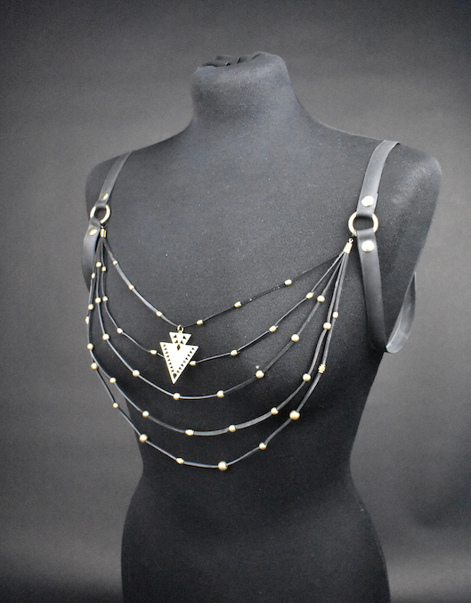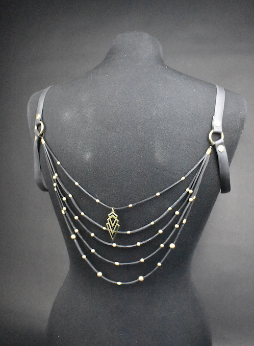 This Harness is one of a kind and simply vegan. The strings are made out of motorbike tyre tube and the shoulder holders are made with bicycle tyre tube. In case it gets tangled up, the strings are attached with small key rings, this way it’s easy to remove and untangle. This harness is simple, this way you can wear it at a party, but also at an elegant dinner. For an easy use, store it on a hanger in your closet. Make a statement with sustainability and beauty.Â
